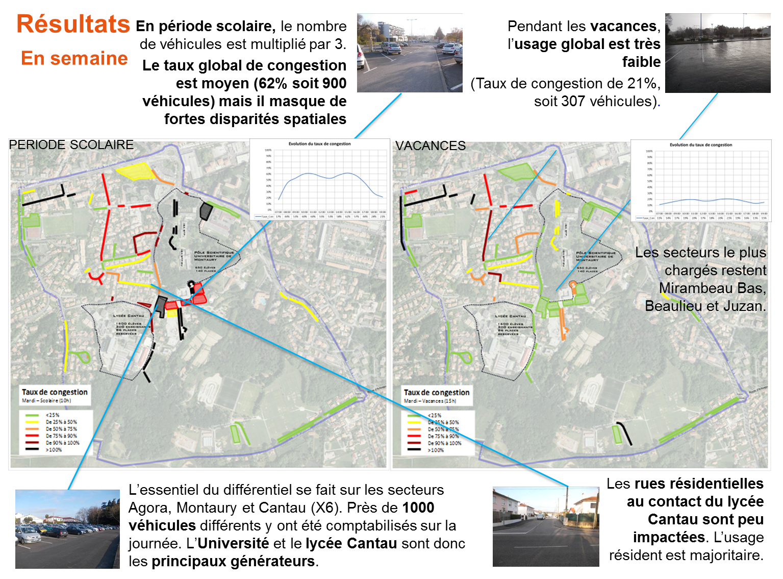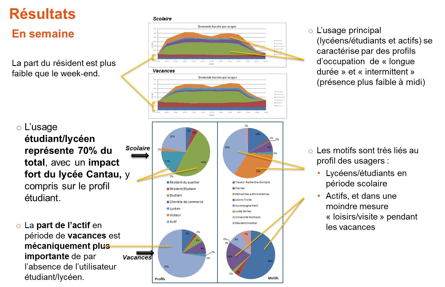 - Enquêtes ciblées en fonction des offres et de leur vocation (rotation, occupation, fonctionnement (zone bleue), interview,…) sur plusieurs périodes : JOB, samedi et dimanche, en période scolaire et pendant les vacances